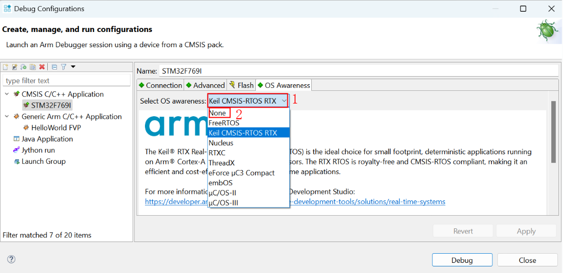 1)、打開(kāi)調(diào)試配置窗體,在“OS Awareness”中,選擇“None”,保存設(shè)置,如圖4-1所示: