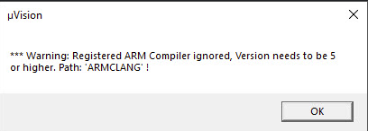 解決在打開工程的時候,出現“Warning: Registered ARM Compiler ignored, Version needs to be 5 or higher. Path: 'ARMCLANG'”警告的問題。