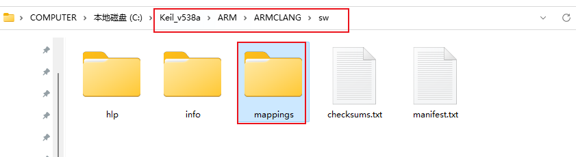 2)、如果檢查發現編譯器的安裝沒有問題,需要檢查C:Keil_v5ARMARMCLANGswmappings文件夾或者 C:Keil_v5ARMswmappings文件夾是否存在(如圖4-2)。這個文件夾中的內容是編譯器在使用的時候必須需要的引導文件。如果缺少可以由工程師將對應版本的mappings中的內容拷貝給客戶或者讓客戶重新安裝軟件。