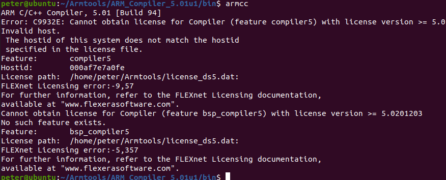 客戶購買了DS-5的license授權后,在Linux環(huán)境下使用Compiler 5.01對于項目進行開發(fā)。但是,在使用Compiler 5.01去進行編譯的時候提示:該license不是該主機的。提示如下圖2-1: