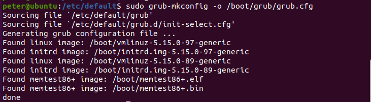 (4)、修改保存好后,通過執(zhí)行“sudo grub-mkconfig -o /boot/grub/grub.cfg”命令,將修改后的內容添加到配置文件中。(如圖4-2-4)