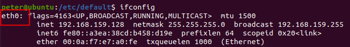 (5)、然后,通過“sudo reboot”對于Ubuntu進行重啟。使得配置項生效。重啟后,可以查看到網卡信息如圖4-2-5所示,變成了eth0。