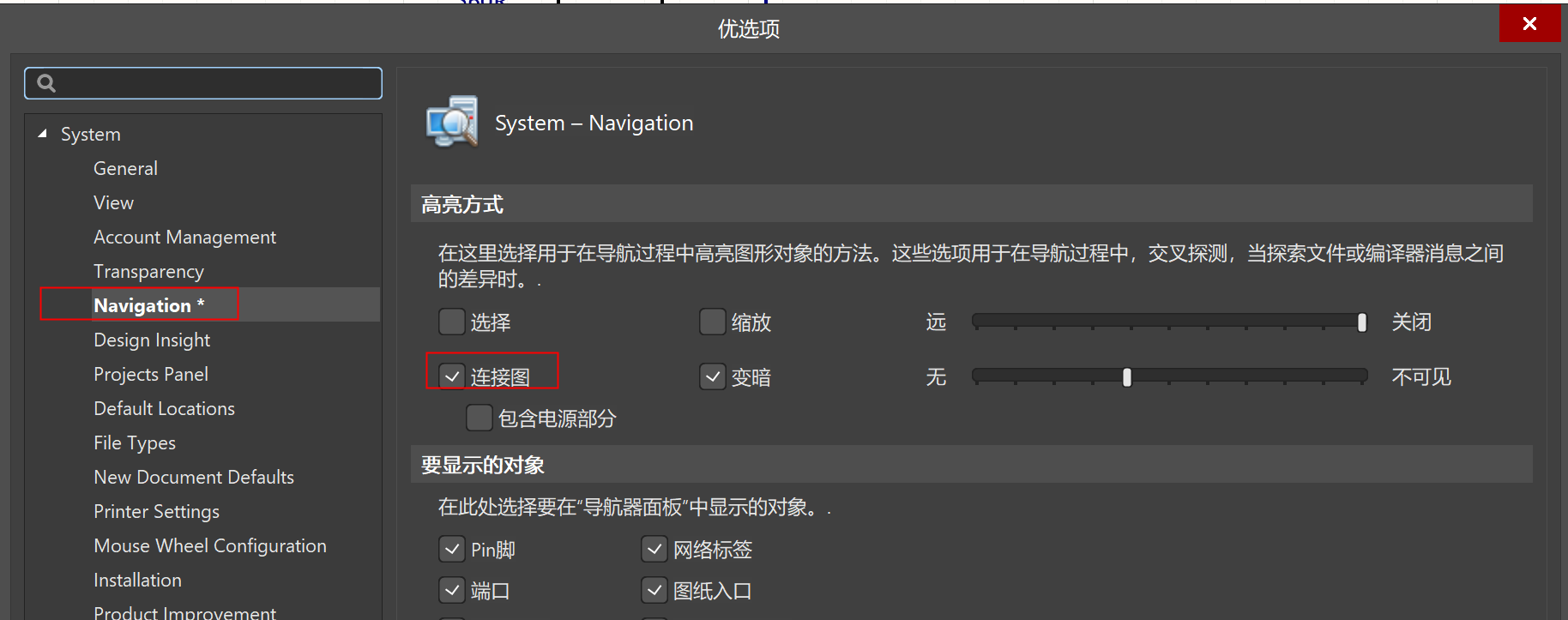 1)、打開有選項設置,找到Navigation設置,勾選“連接圖”。