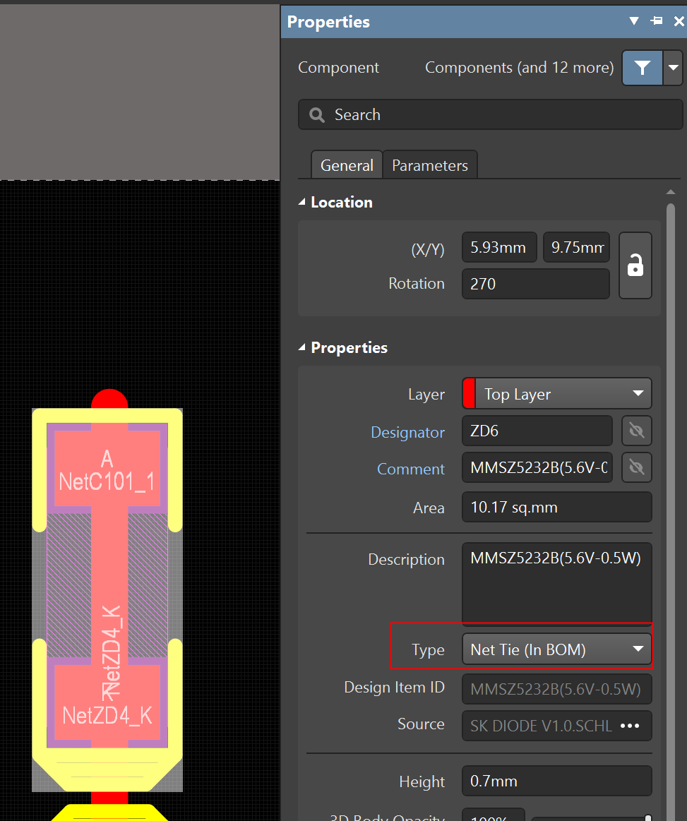 如果PCB布線時遇到此類情況,查看該元件屬性,將元件類型(Type)從Net Tie改為Standard,即可解決此問題。