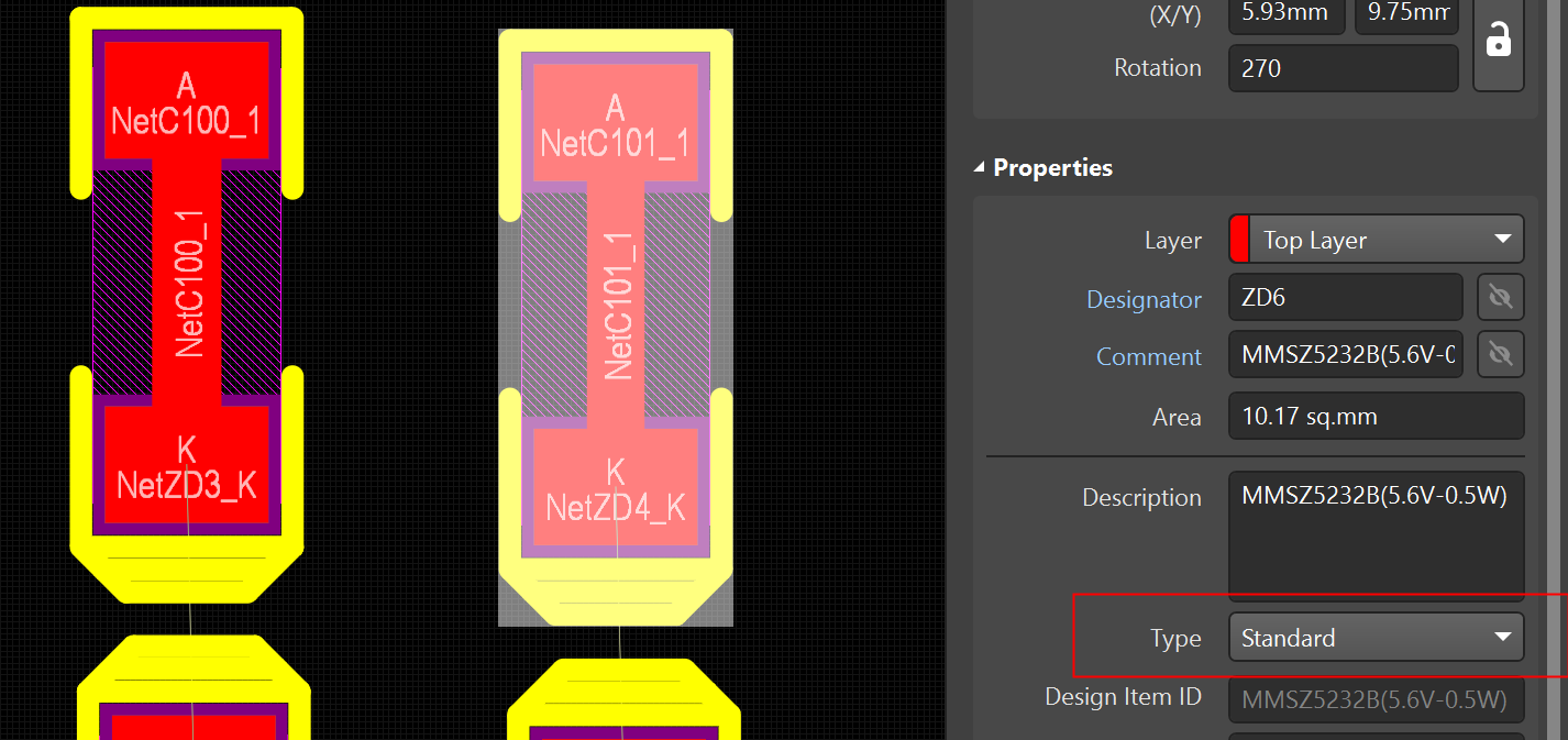 創建元件庫時,需要選擇元件類型,默認標準元件都是Standard,當元件類型錯誤選擇了Net Tie之后,對PCB布線會產生影響,Net Tie不同于Standard,將一個元件的類型設置為Net Tie之后,該元件將可以作為跳線使用,不同網絡的焊盤與焊盤之間可以進行連接,并且DRC不會報錯,如圖2。