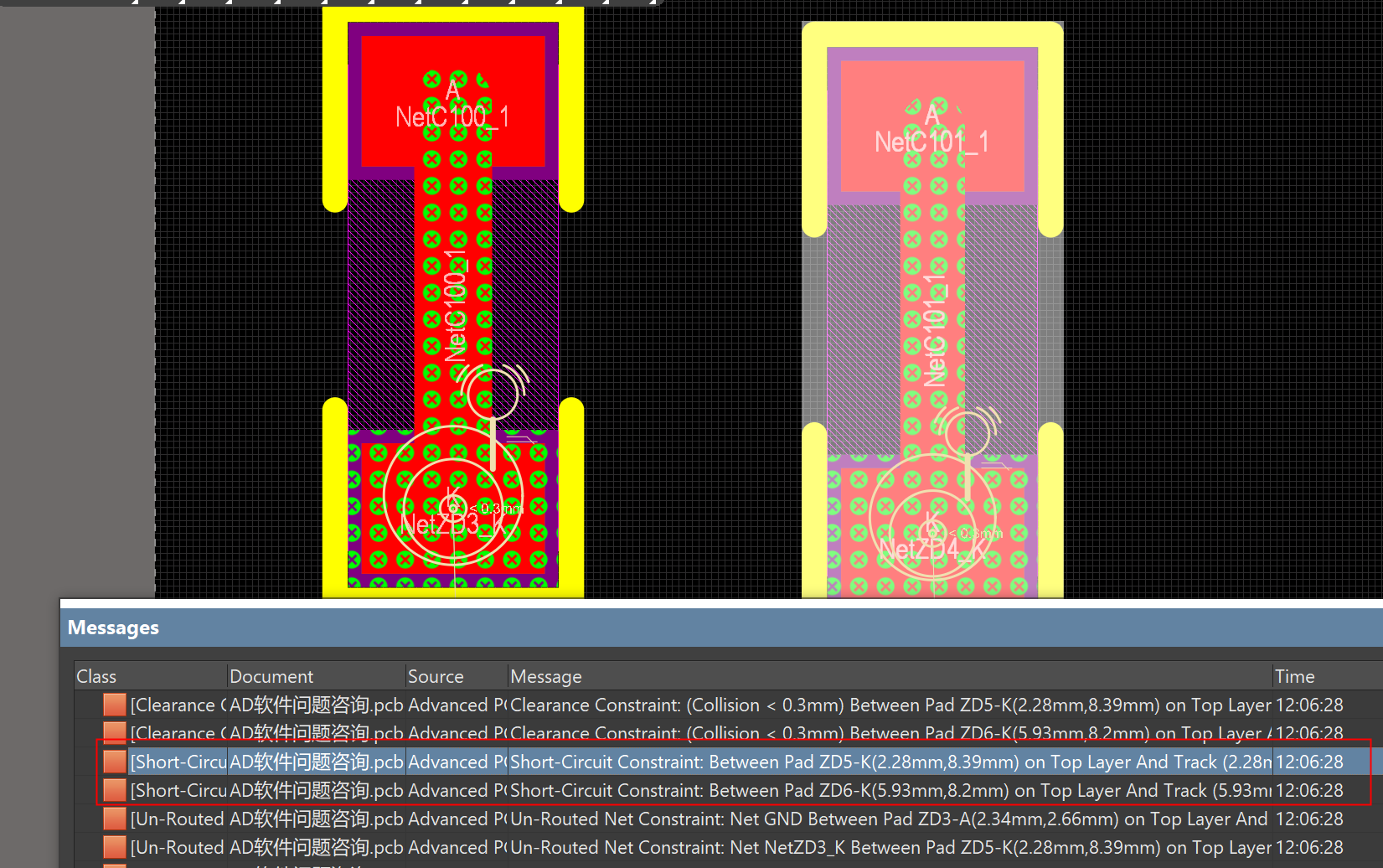 運行DRC檢查,檢查出不同網絡的短路報錯。