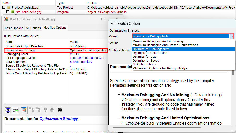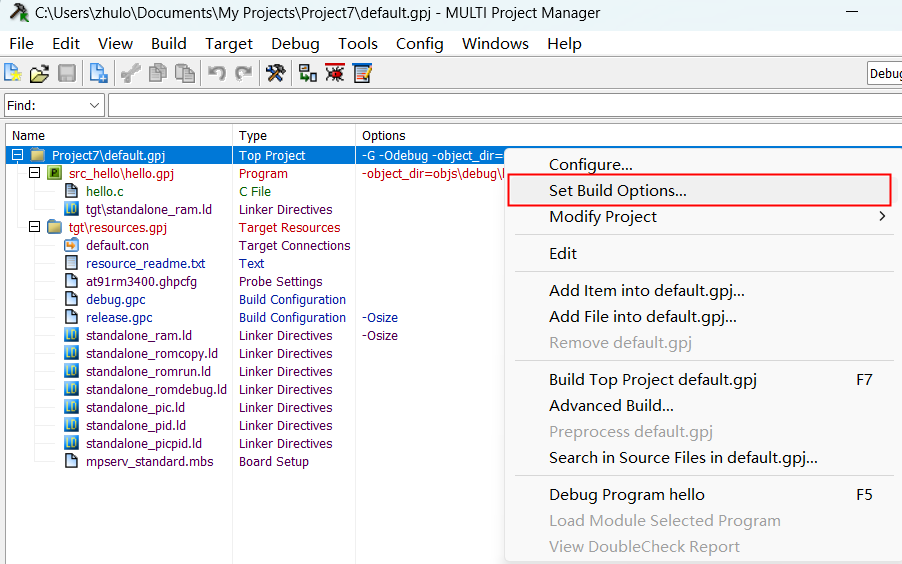 1)、進(jìn)入項(xiàng)目的設(shè)置內(nèi),選擇project后右鍵選擇“Set Build Options...”,設(shè)置整個(gè)項(xiàng)目的優(yōu)化等級(jí),例如下圖我們?cè)O(shè)置為-Odebug模式。