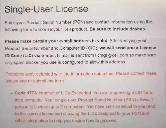 在安裝LIC時(shí),在Keil單用戶許可證頁(yè)面上單擊Submit后出現(xiàn)錯(cuò)誤:Code 1773 Number of LICs for this PSN Exceeded.