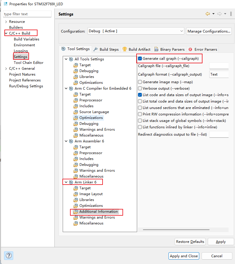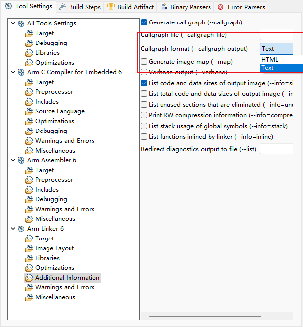 1)、可以通過對應(yīng)工程的Properties窗口中,C/C++ Build->Setting->Arm Linker 6->Additional Information配置中,有一個Generate call graph(--callgraph)的選項(如圖4-1)。這個選項可以生成記錄工程函數(shù)的調(diào)用關(guān)系的文件。