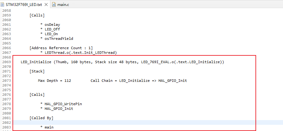 LED_Initialize (Thumb(使用的指令集), 160 bytes(函數(shù)的大小), Stack size 48 bytes(堆棧的大小), LED_769I_EVAL.o(.text.LED_Initialize)(函數(shù)所在的源文件))