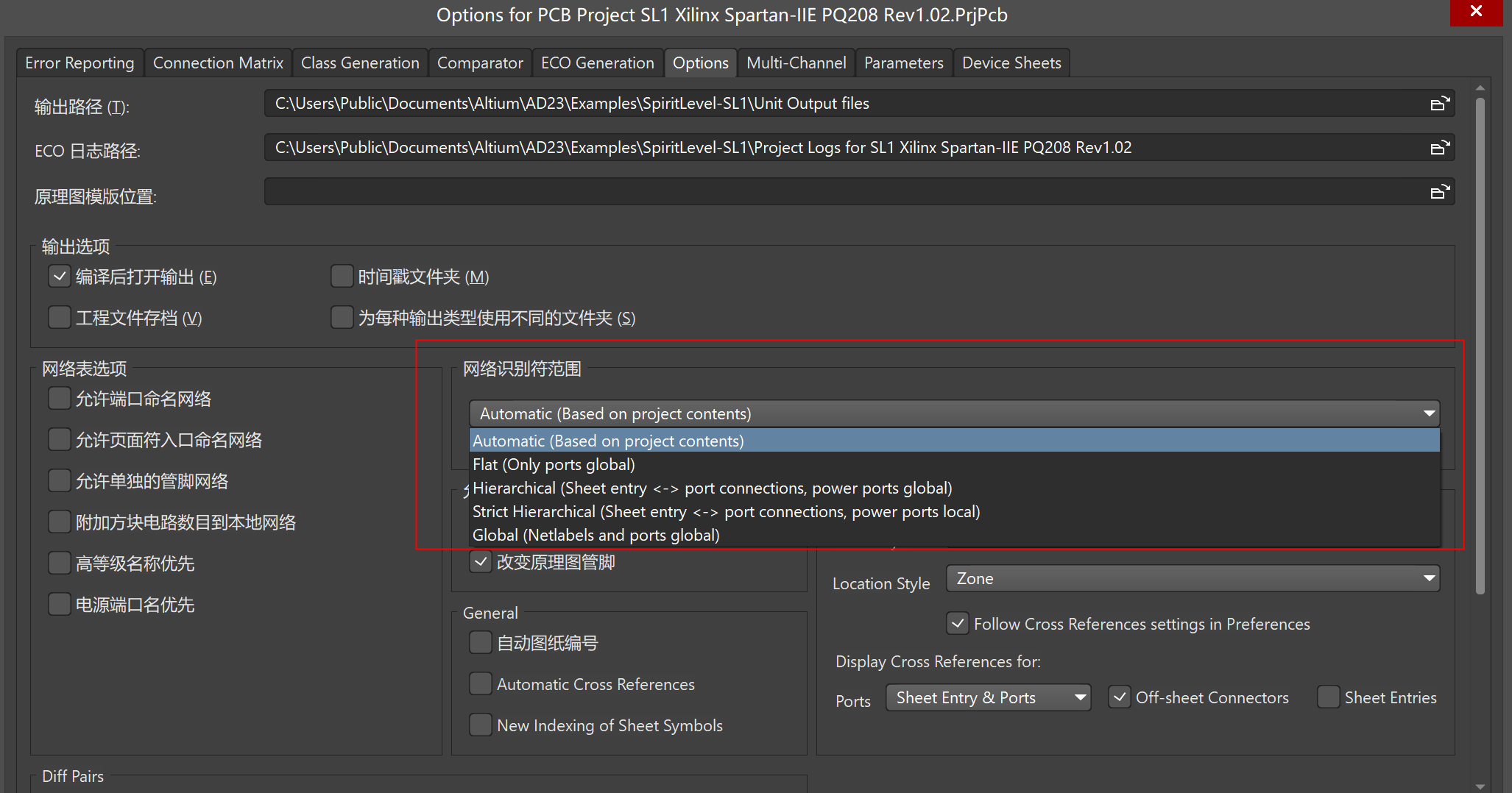 默認(rèn)選項(xiàng),系統(tǒng)會(huì)檢測(cè)項(xiàng)目圖紙內(nèi)容,自動(dòng)調(diào)整網(wǎng)絡(luò)標(biāo)簽識(shí)別范圍。當(dāng)原理圖中有Sheet Entry標(biāo)識(shí),則網(wǎng)絡(luò)標(biāo)簽識(shí)別范圍調(diào)整為Hierarchical;如果原理圖中沒有Sheet Entry標(biāo)識(shí),但是有Port,則網(wǎng)絡(luò)標(biāo)簽識(shí)別范圍調(diào)整為Flat;如果原理圖中既沒有Sheet Entry標(biāo)識(shí),也沒有Port,則網(wǎng)絡(luò)標(biāo)簽識(shí)別范圍調(diào)整為Global。