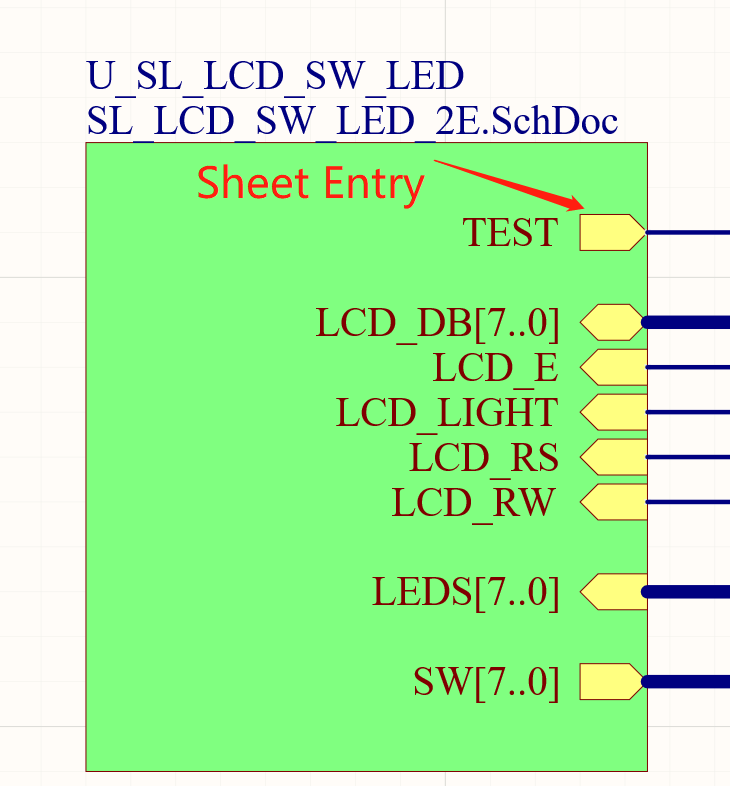 層次式結(jié)構(gòu)。項(xiàng)目中原理圖使用了層次結(jié)構(gòu)。這種情況下,網(wǎng)絡(luò)標(biāo)簽、Port的作用范圍都是在單張圖紙以內(nèi)。Port可以與上層圖紙的Sheet Entry連接,以縱向方式在圖紙之間傳遞信號(hào)。圖2就是層次化結(jié)構(gòu)中上層圖紙中顯示的Sheet Entry。