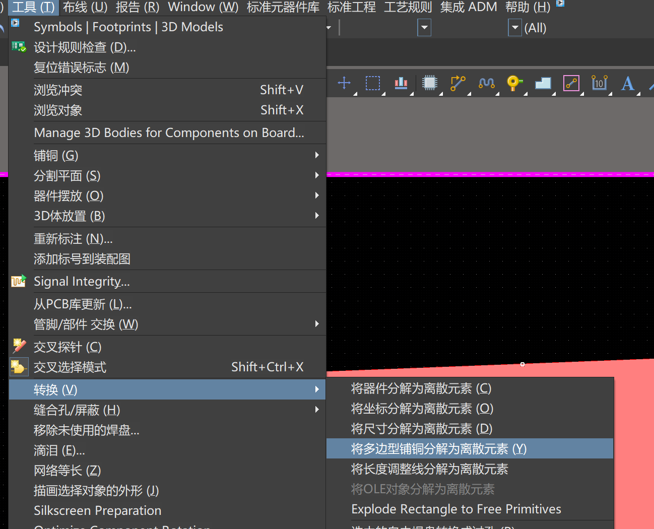 2)、復制該鋪銅,并且進行原位粘貼,選中復制的鋪銅,執行“工具”--“轉換”--“將多邊形鋪銅分解為離散元素”。轉換后,原polygon屬性的鋪銅將變成region。