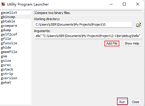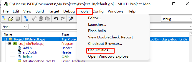 2)、想要使用這個命令的話,可以在MULTI Project Manager窗口中的Tools->Use Utilities打開Utility Program Launcher窗口使用到gbincmp這個執行程序。(如圖4-1和圖4-2)