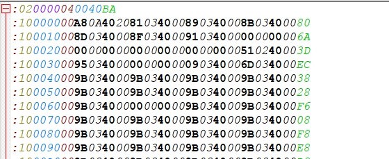 (1)、HEX文件的開頭第一行(如圖4-3-1):“:020000040040BA”