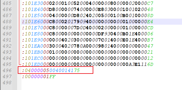 (4)、Hex文件的倒數第二行數據(如圖4-3-3-2):“:040000050040014175”