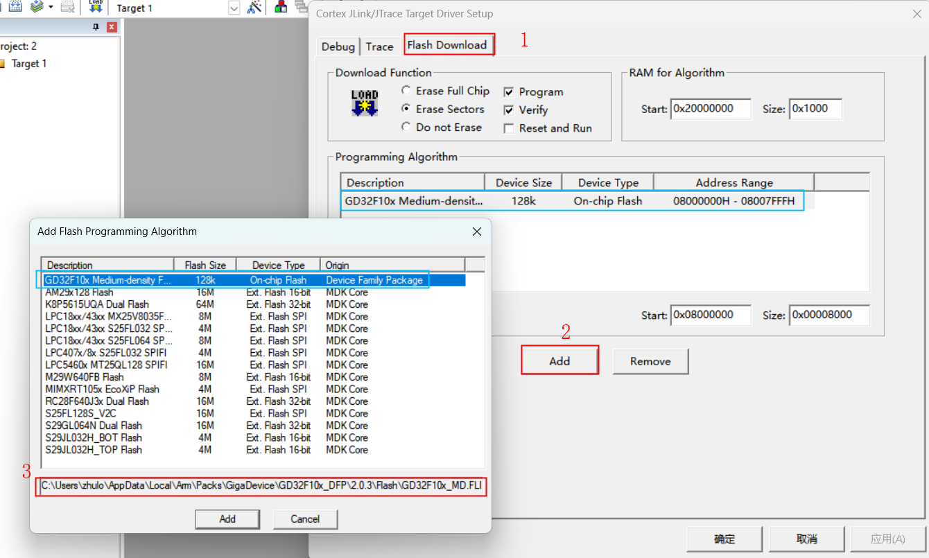 2)、在IDE中打開(kāi)配置界面,進(jìn)入“Flash Download”界面、點(diǎn)擊“Add”、查看該芯片的燒錄文件、下方有該文件的存放位置。
