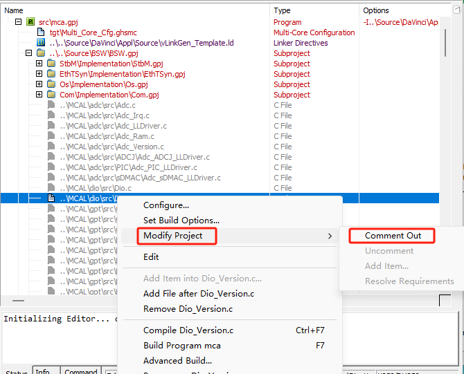 想要將對應的文件取消注釋,還是一樣,通過菜單中Modify Project的Uncomment選項去取消對應文件的注釋即可。