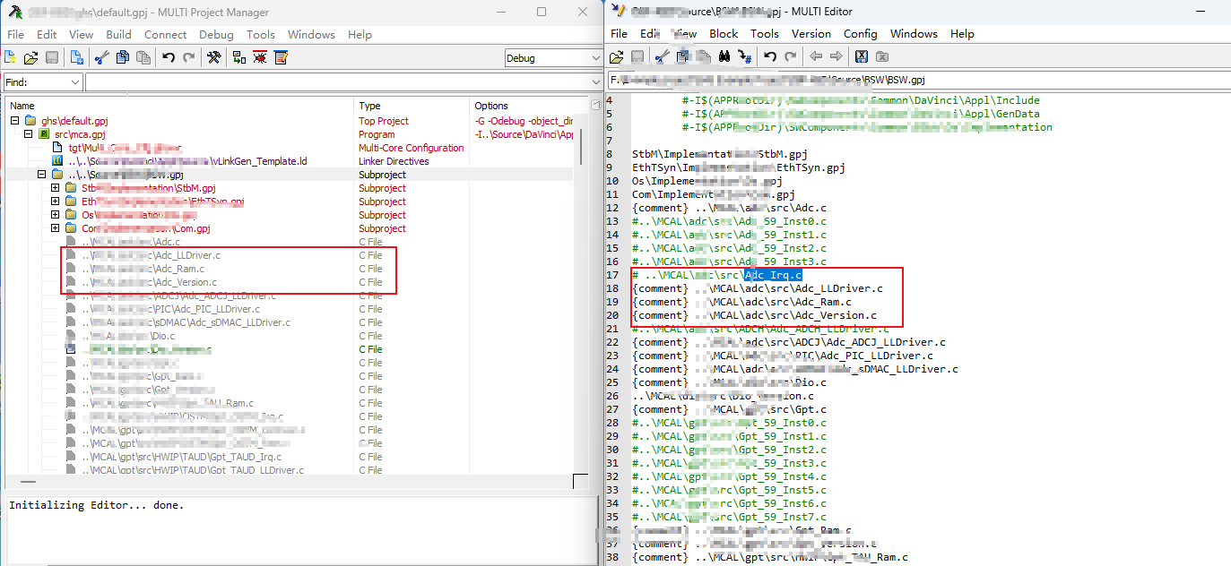 (2)、如果對應的源文件連工程目錄中都不想顯示出來的話,可以在對應的源文件路徑前面添加“#”。這樣就可以將對應的源文件在工程目錄中直接摘除。如,在圖4-2-1中一開始用“{comment}” 注釋掉的源文件Adc_Irq.c。在圖4-2-2中直接用“#”后,在工程目錄中這個文件就直接被摘除了。后續想要添加回來就去掉”#“就行。