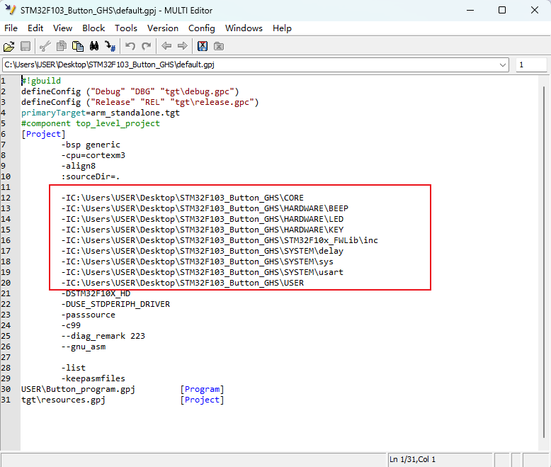 3)、示例:在工程下,我的所有頭文件都在“C:UsersUSERDesktopSTM32F103_Button_GHS”路徑下面,這個是根路徑(如圖4-3)。通過通配符的定義,將配置文件中所有的“C:UsersUSERDesktopSTM32F103_Button_GHS”都用通配符替代。(如圖4-4)