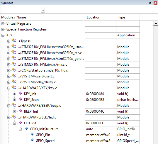 5)、通過Symbols窗口就可以進一步地了解工程中的變量定義情況、內(nèi)存地址、偏移量等各項的變量信息。
