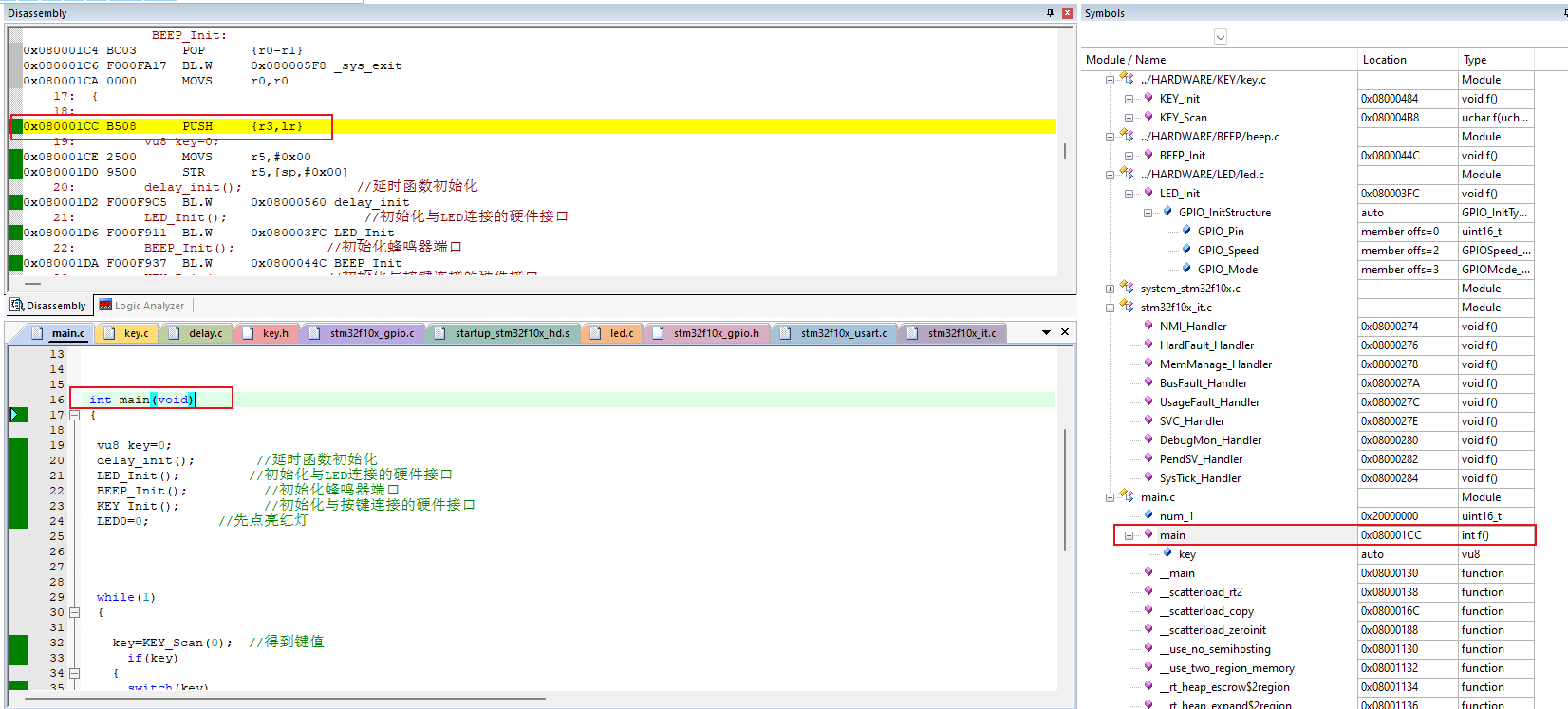 3)、在Symbols窗口中可以看到主函數(shù)main的內(nèi)存地址是0x080001CC。返回類型是int類型。通過代碼和匯編窗口就可以確認(rèn)數(shù)據(jù)的正確與否。(如圖4-3)