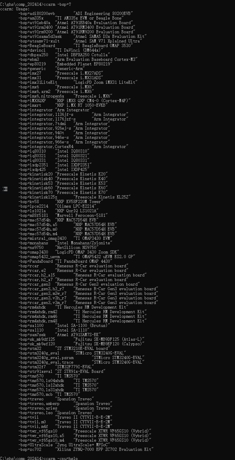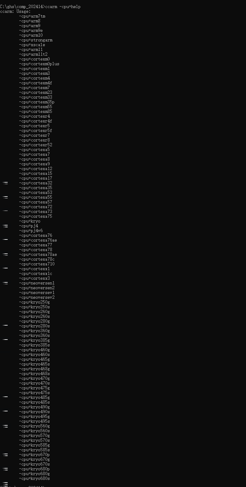 ccarm.exe -cpu=help
