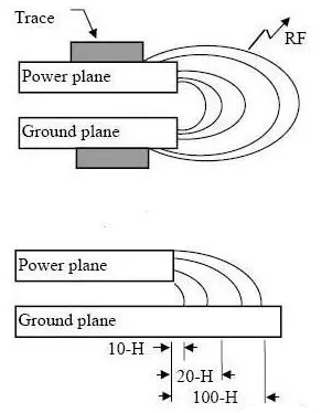 為抑制邊緣輻射效應(yīng),電源層相對地層內(nèi)縮20H的距離,也就是需要符合 20H 原則。