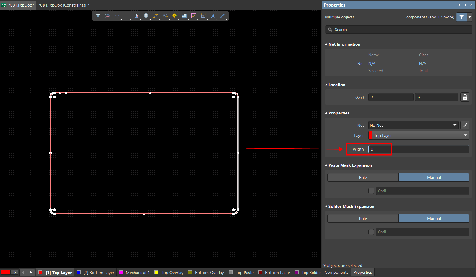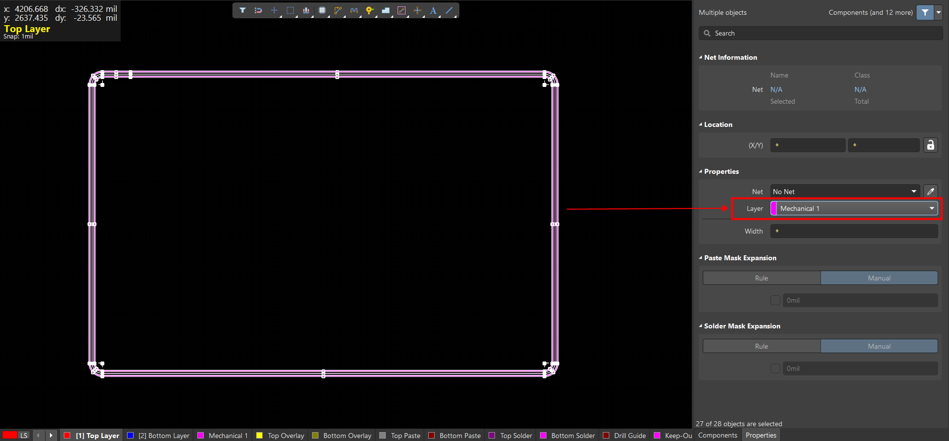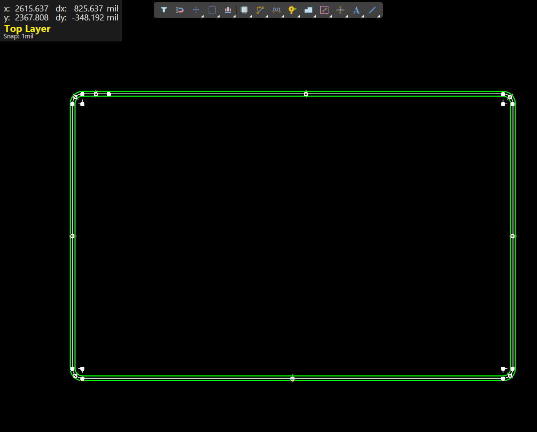 1. 在 TOP層繪制一個圓角矩形(在機械層不行),全選邊框,在屬性板中將線寬修改為 0mil。