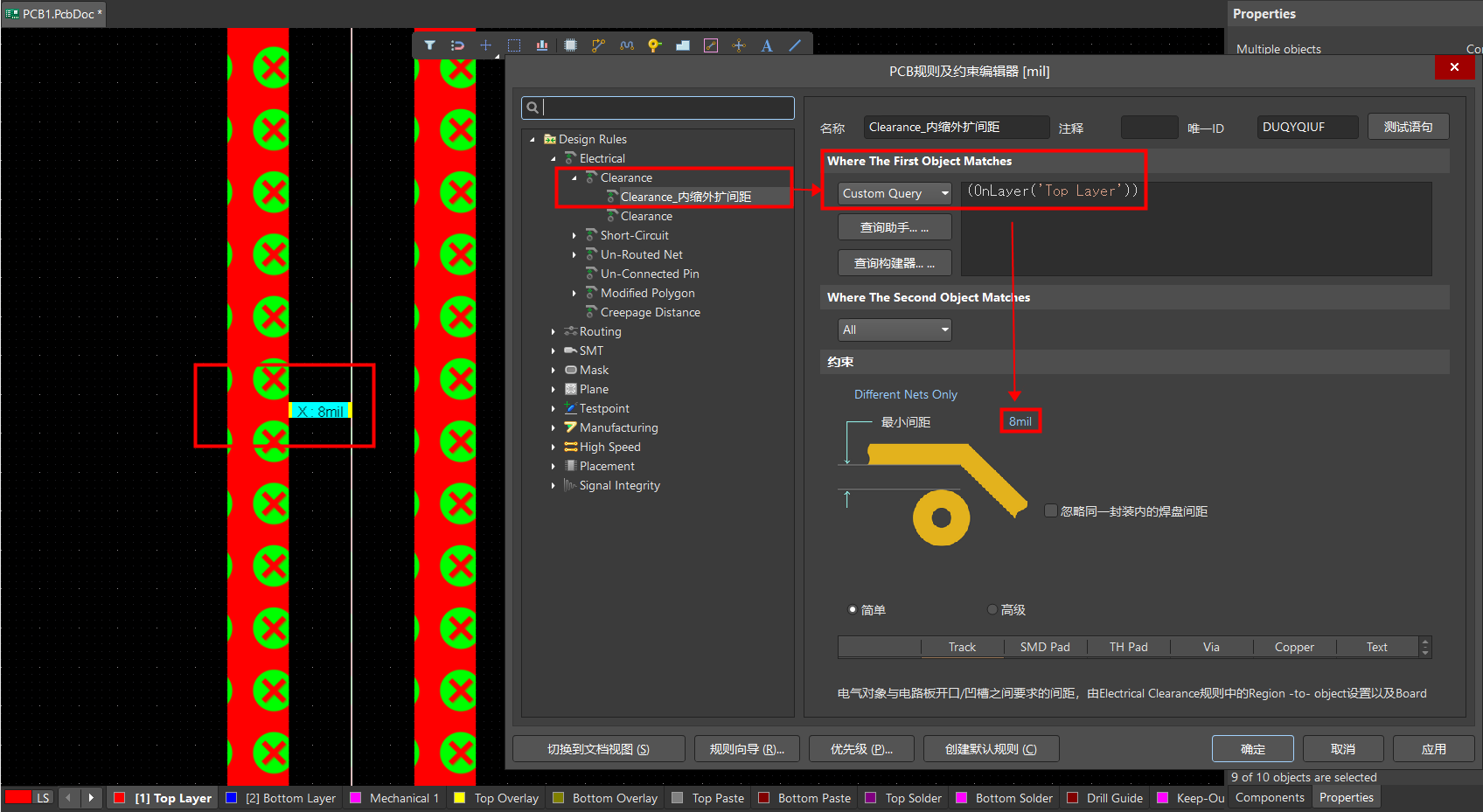 4. 如何自定義設(shè)置內(nèi)縮和外擴的距離,這里可以添加一條規(guī)則進行約束。(設(shè)置完之后可以將該規(guī)則取消使能)