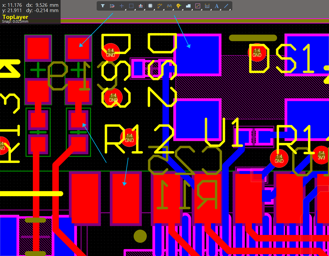 在 PCB 界面下,發(fā)現(xiàn)焊盤的不顯示標(biāo)號和網(wǎng)絡(luò)名稱。下圖箭頭所示,頂層或者底層焊盤都沒有信息顯示。