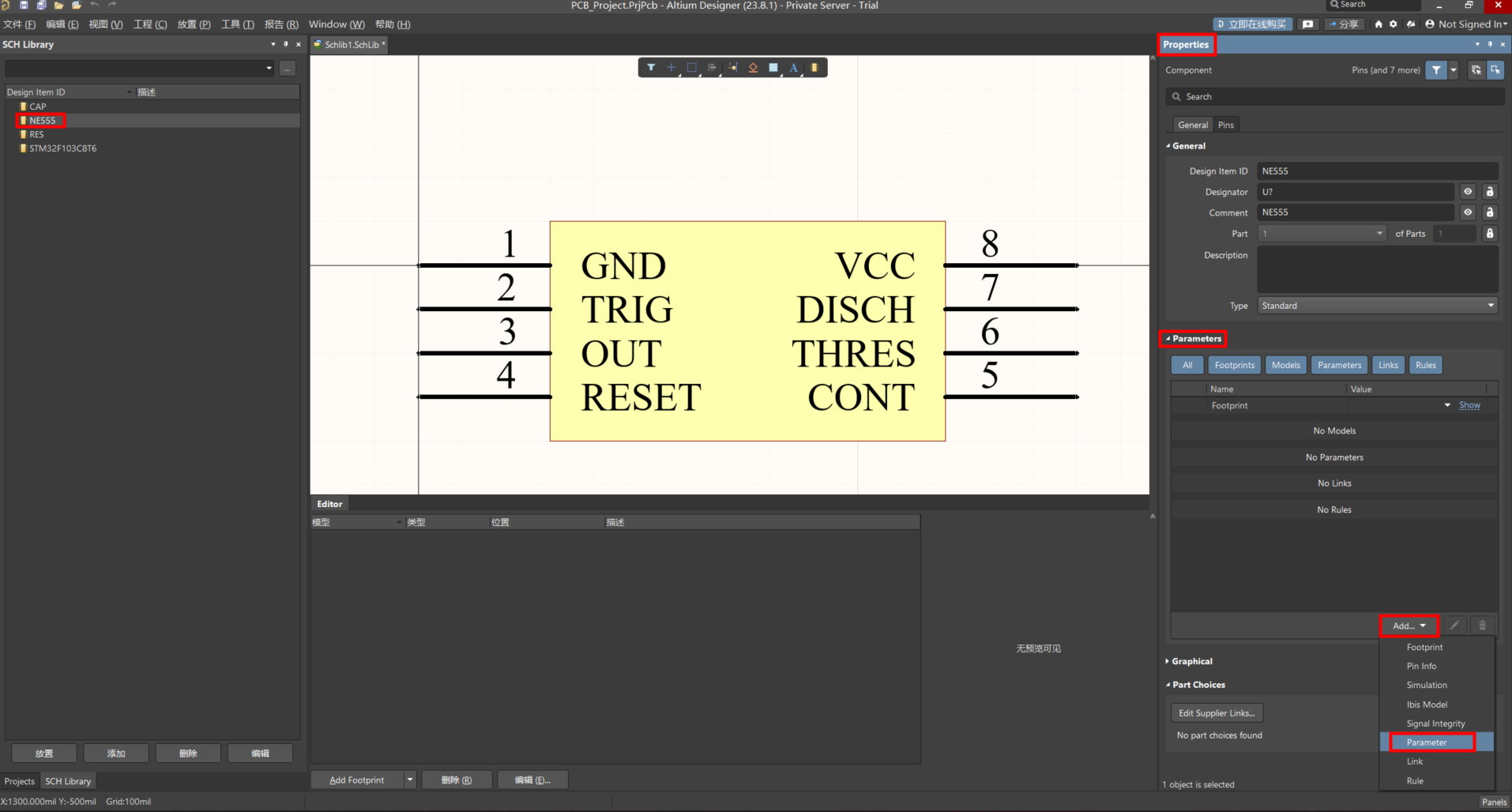 打開原理圖庫文件,找到想添加的芯片的原理圖,我們以 NE555 為例: