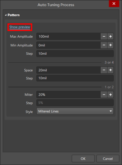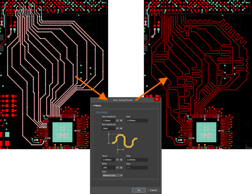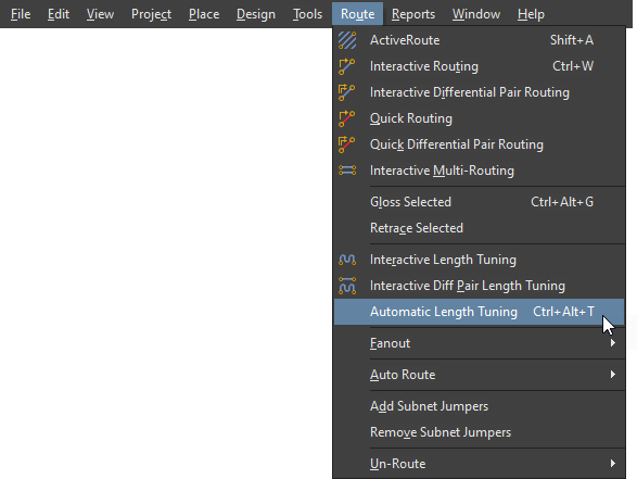 從主菜單中選擇【Route】→【 Automatic Length Tuning】 快捷鍵:Ctrl+Alt+T