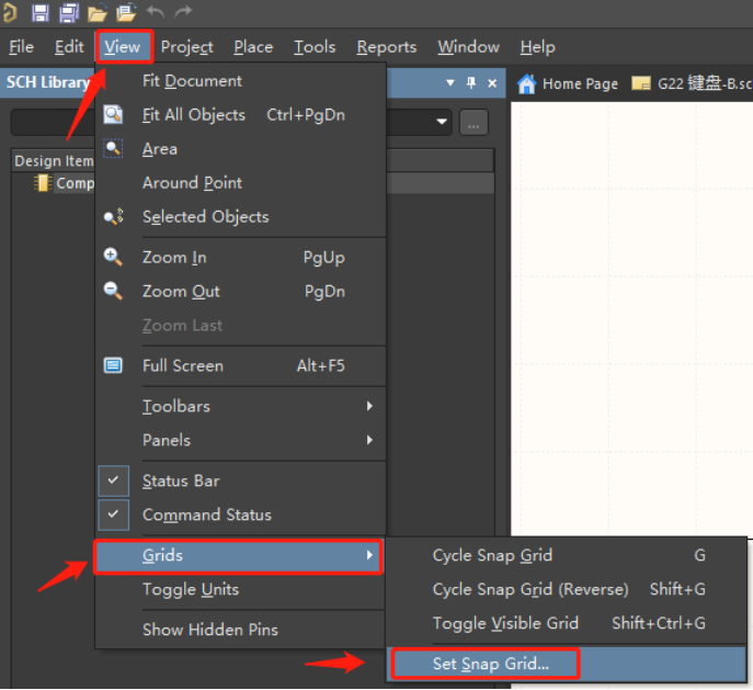 在原理圖庫編輯界面按快捷鍵G,可在10mil/50mil/100mil之間循環(huán)切換。