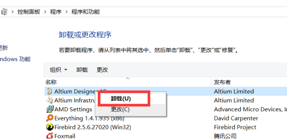 在電腦控制面板找到對(duì)應(yīng)的Altium?Designer軟件程序,鼠標(biāo)右鍵選擇卸載,如下: