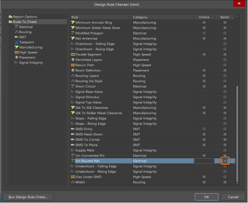 使用工具 ? 設計規則檢查 選擇左側窗格中的“檢查規則”選項卡,然后選中“未布線網絡”行的“批處理”列中的框靠近底部。單擊左下角的按鈕以“運行設計規則檢查... ”。請注意,此檢查不在線提供。運行 DRC 后,錯誤標記將顯示在您的 PCB 上。您可以使用工具 ? 重置錯誤標記來刪除它們。