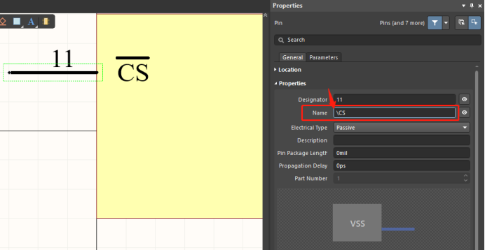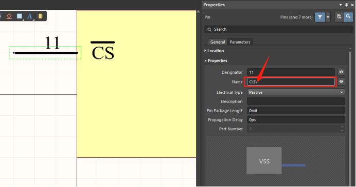 在原理圖庫編輯界面雙擊需要設(shè)置的引腳或者在放置引腳的狀態(tài)下按Tab鍵;在彈出的Properties面板中,Name文本框內(nèi),在字符串的最前面加上一個反斜杠“”,這樣就可以實現(xiàn)在整個管腳名稱上增加上劃線。