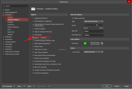從Altium Designer 21版本開始,當在Preference界面下的Schematic-->Graphical Editing 選項卡中,勾選Single ’’ Negation 后。單擊Apply及OK完成設(shè)置。