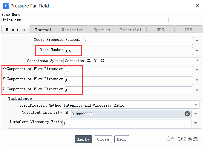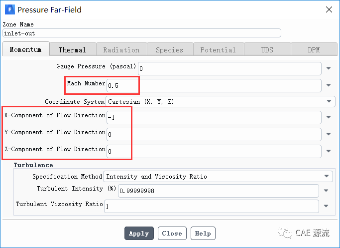 5.邊界條件入口邊界采用壓力遠(yuǎn)場邊界,速度為0.5個馬赫數(shù),即子彈出膛后的速度為0.5個馬赫數(shù),之后在風(fēng)阻的作用下速度開始減小。