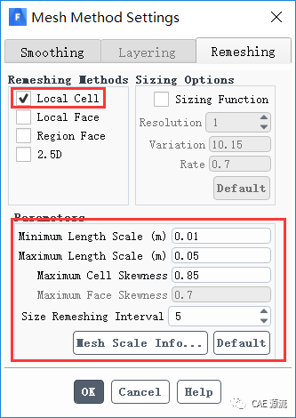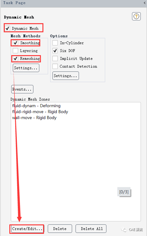 進(jìn)入Dynamic Mesh面板,勾選Smoothing和Remeshing并打開Six DOF模型,然后進(jìn)行動網(wǎng)格區(qū)域的定義