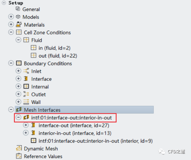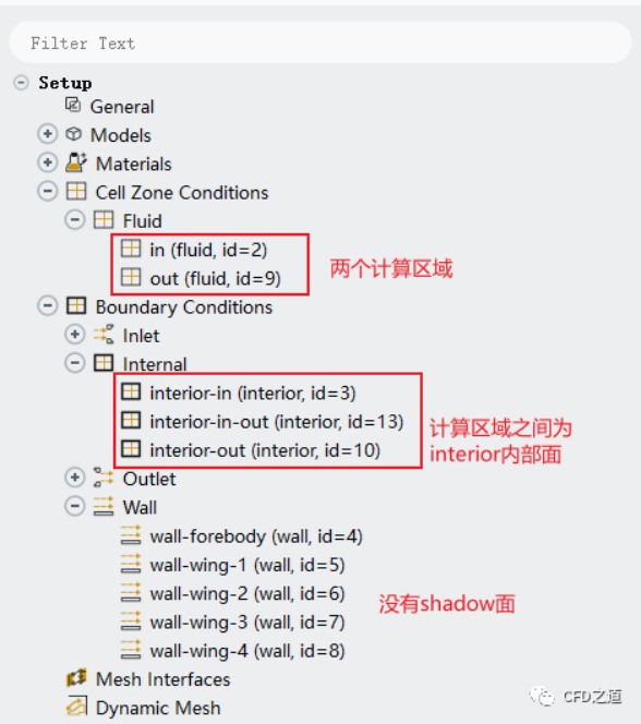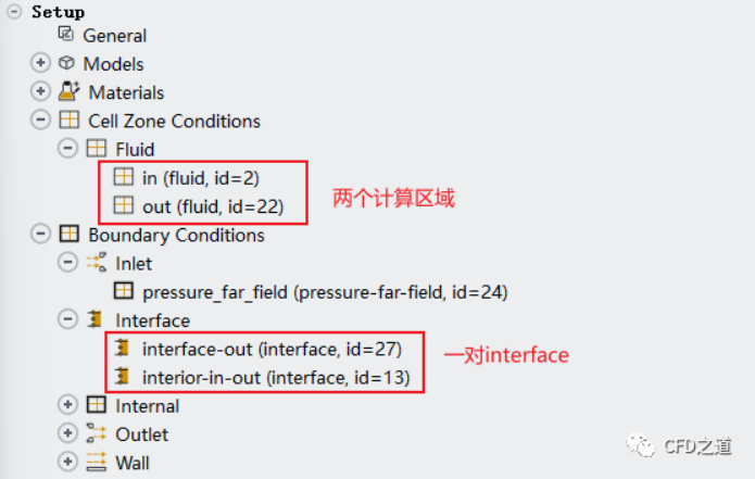讀取完畢后計算區域與邊界如下圖所示。此時有2個計算區域,還有2個interface邊界。