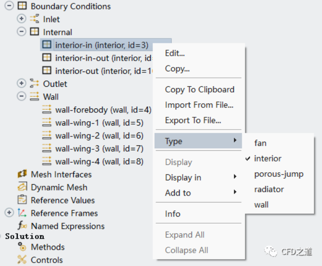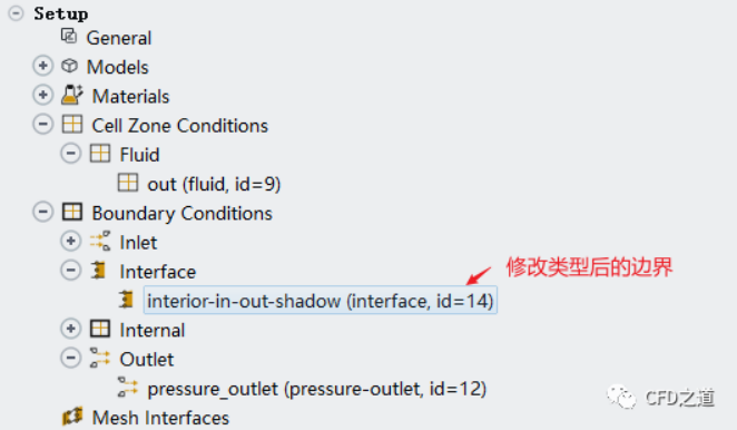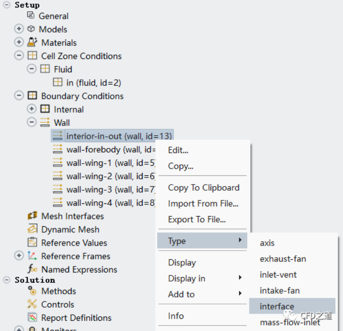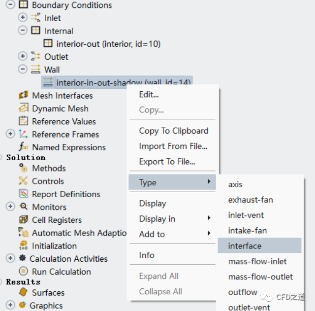 修改上面自動轉化成的wall邊界的類型,將其修改為interface類型,如下圖所示操作