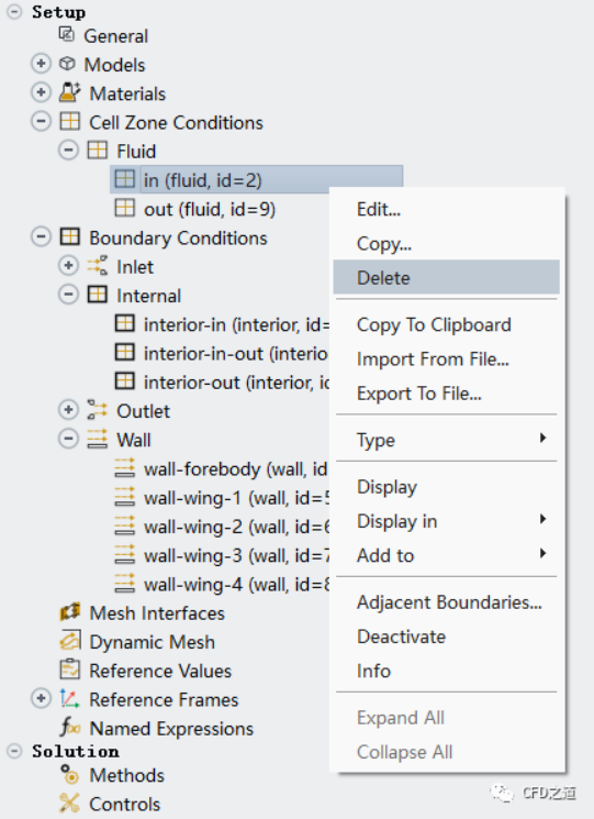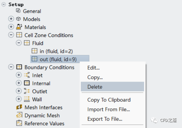 刪除完畢后計算區域中只剩下out區域,且原來的內部面自動修改為wall類型的邊界,如下圖所示。