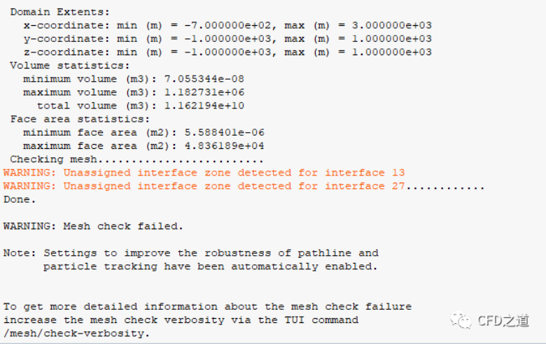 此時檢查網格會有警告信息,因為沒有創建Mesh Interface