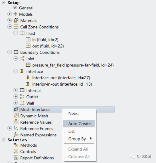 右鍵選擇模型樹按鈕Mesh Interfaces,點擊彈出菜單項Auto Create自動創建網格交界面