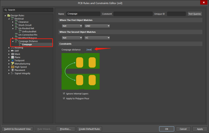在進行規則設置時,電氣類規則中PCB間距(Clearance)和爬電距離(Creepage Distance)的區別如下: