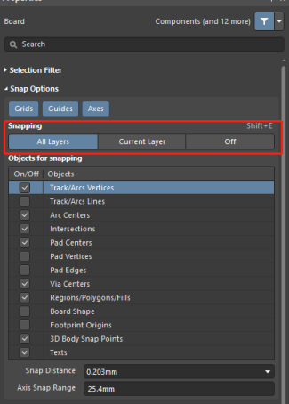 用于切換設(shè)計(jì)對象的捕捉啟用方式,All Layers(所有層)Current Layer(僅當(dāng)前層)Off(關(guān)閉捕捉),也可以通過Shift+E切換;