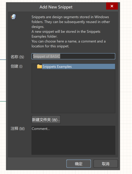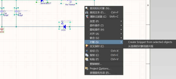 在確定好保存文件夾后,關(guān)閉該對話框,在原理圖中選中想要摘錄出來的部分電路,然后鼠標右鍵,選擇【片段】,會出現(xiàn)兩條指令(Create Snippet from selected objects和從選擇的對象創(chuàng)建片段),實測下來,兩跳指令除了打開的對話框不同之外,實現(xiàn)的功能是相同的。