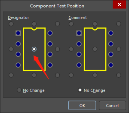 將位號(hào)放置在元件內(nèi)部時(shí),先按快捷鍵Ctrl+A全選,再按快捷鍵A+P,打開“Component Text Position”對(duì)話框,在“Designator”中選擇中間位置,點(diǎn)擊OK ,這樣就可以把標(biāo)號(hào)都放置在元件內(nèi)。