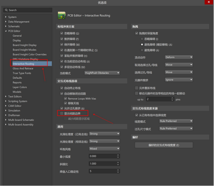 打開優選項,在交互式布線一欄將“顯示間距邊界”這一復選框勾選上即可。注:在忽略障礙走線模式下,不能使用顯示間距邊界這一功能。具體操作請參考下圖步驟: